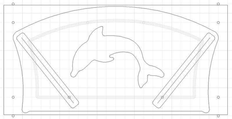 Walnut dolphins for inlays (3ply), earrings (5ply), etc. Inlay example was done as four 94mm coasters. The 80mm dolphins are machined full depth (no tabs) on a vacuum fixture using a 2mm bit.[ comment | link | top ]