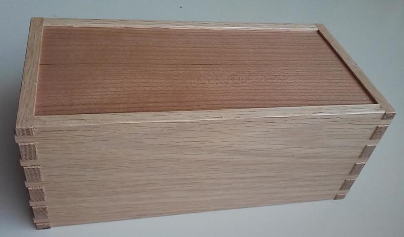 Oak box tray with proud dovetail corner joints and Cherry bottom. The tray was sized to accommodate 3 x 5" storage bags and measures ~3-5/8 x 7-3/8 x 3". The tray is finished, inside and out, with WB acrylic.