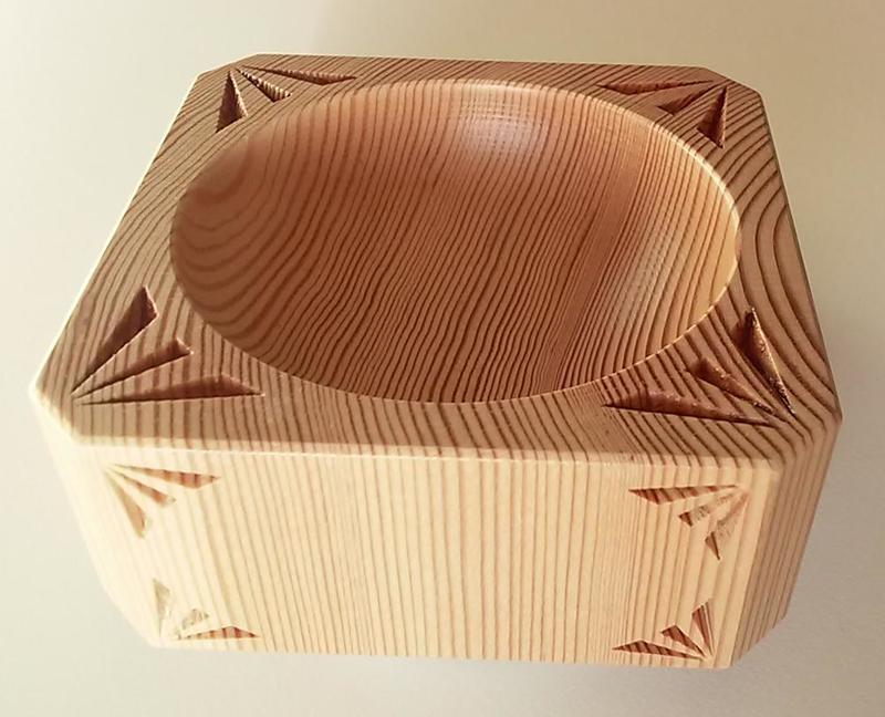 Douglas Fir spiral cut endgrain bowl with chip carving inspired corner carves on the top and four sides. Finish: WB acrylic, Size: ~3-3/8 x 3-3/8 x 1-3/8".[ comment | link | top ]
