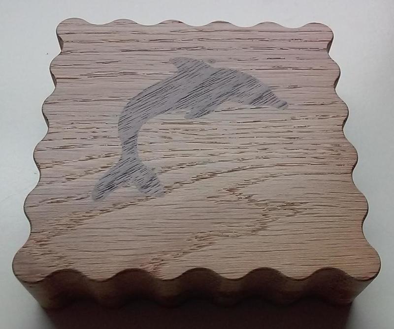 Walnut dolphins for inlays (3ply), earrings (5ply), etc. Inlay example was done as four 94mm coasters. The 80mm dolphins are machined full depth (no tabs) on a vacuum fixture using a 2mm bit.