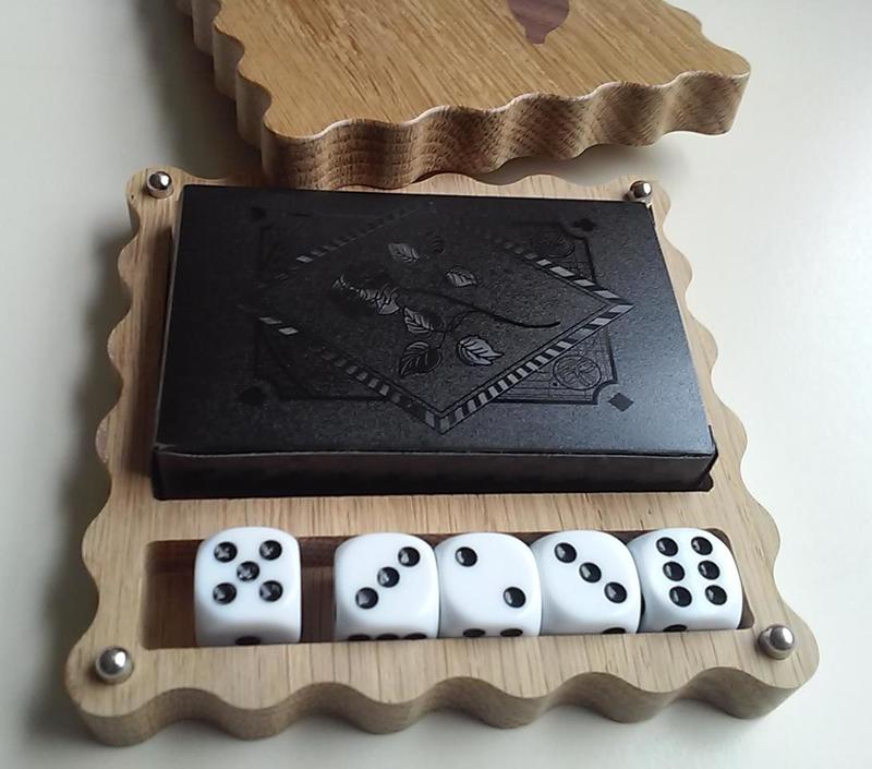 Oak box with a walnut inlay and interior recesses for playing cards and dice, cribbage pins, etc. Finish: WB acrylic exterior, Size: ~4-1/2 x 4-1/2 x 1-1/8"