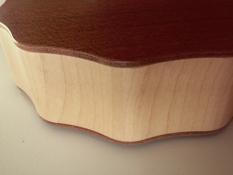 An all face grain box made from twelve vertical pieces of Maple machined into a cloudlike shape. The bottom and top are five ply Sapele, the subtop is seven ply Western Maple and the inlay is three ply Walnut. Finish: WB acrylic, Size: ~5-3/8 x 1-3/8"