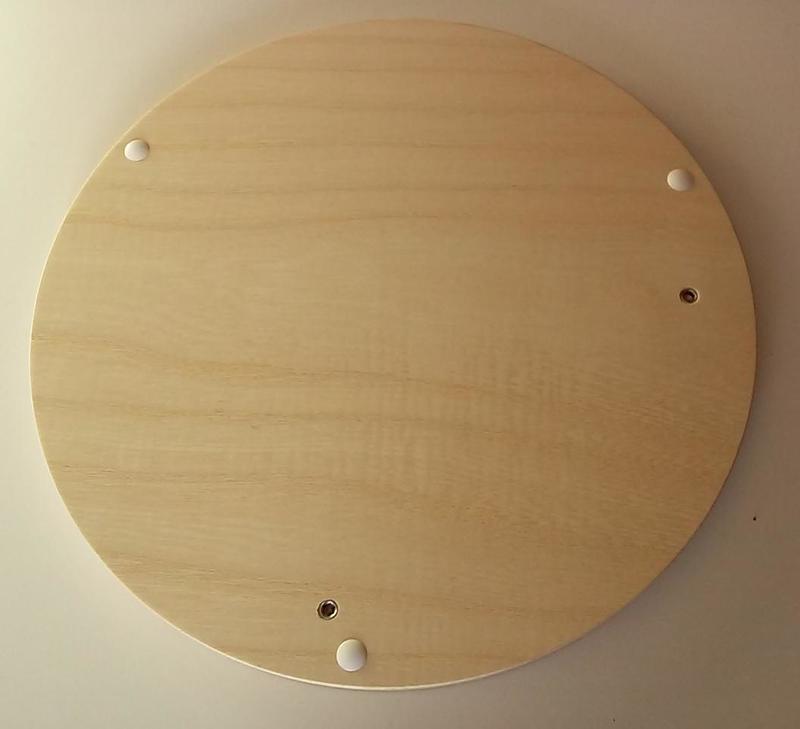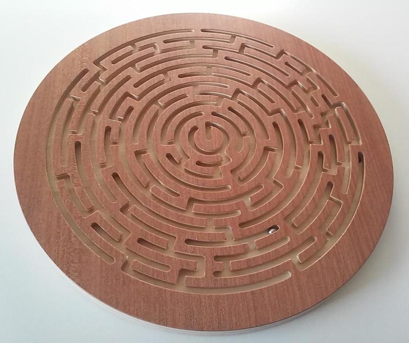 A ball in a maze that doesn't need an acrylic cover to keep the ball in the maze. The maze has three start/end points, center plus two on the perimeter. The two setscrews (back) are the perimeter marks (top) and allow running the maze with more than one ball. It's a working protype that was made with MDF, Koto (e.g. back) and Makore (top). Finish: WB acrylic, Size: 8-1/2 x 7/16".