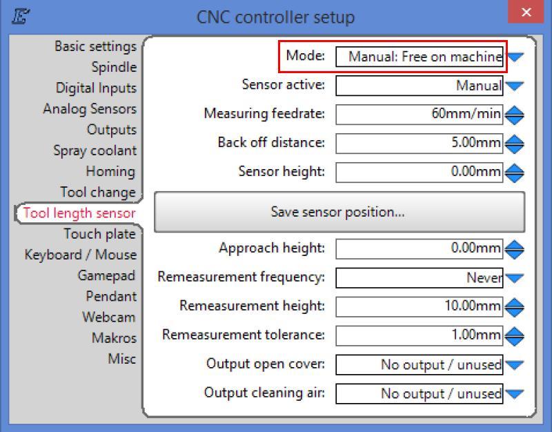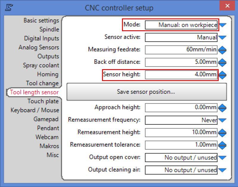 To setup the sensor go to Setup : CNC controller : Length sensor. I use a speed of 60mm/min for all automatic probing functions. Back off distance can be whatever you want. V12 has additional options, Mode: 'Manual: Free on machine' (sensor on bed or material) works the same as v11. Using the optional v12 'Sensor active' options requires setting the input to length sensor. Sensor height should be 0. The settings fixed location option requires homing be enabled, but a fixed location at, or relative to, the project origin/0,0 point is also possible (Setup: CNC program : Texts : Tool change).