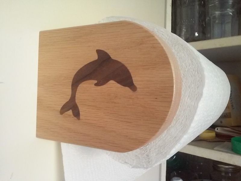 A minimalist paper towel holder in Oak with a walnut inlay and finished with WB acrylic. The recessed mounting hardware allows it to be mounted to vertical or horizontal surfaces. When mounted to screws located 12" apart it will accommodate standard 11" wide rolls with an up to 6-1/2" diameter. Size: ~5-1/2 x 4 x 1-3/4".[ comment | link | top ]