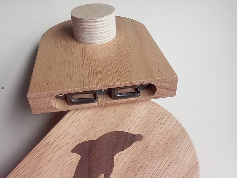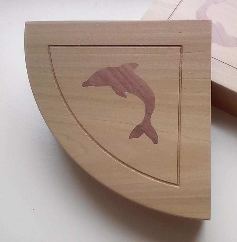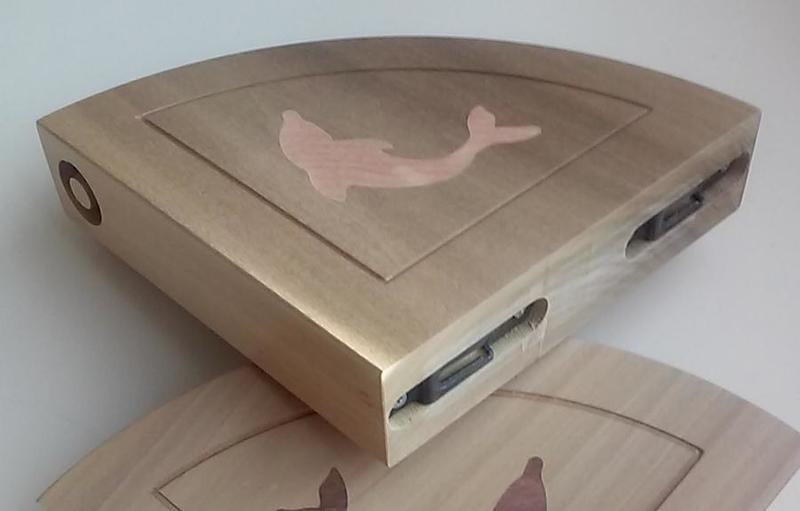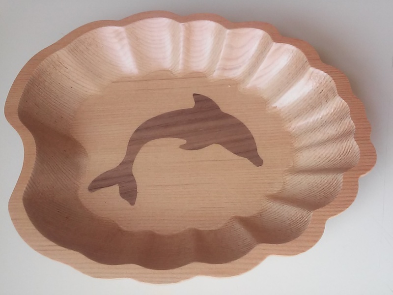 Walnut dolphins for inlays (3ply), earrings (5ply), etc. Inlay example was done as four 94mm coasters. The 80mm dolphins are machined full depth (no tabs) on a vacuum fixture using a 2mm bit.