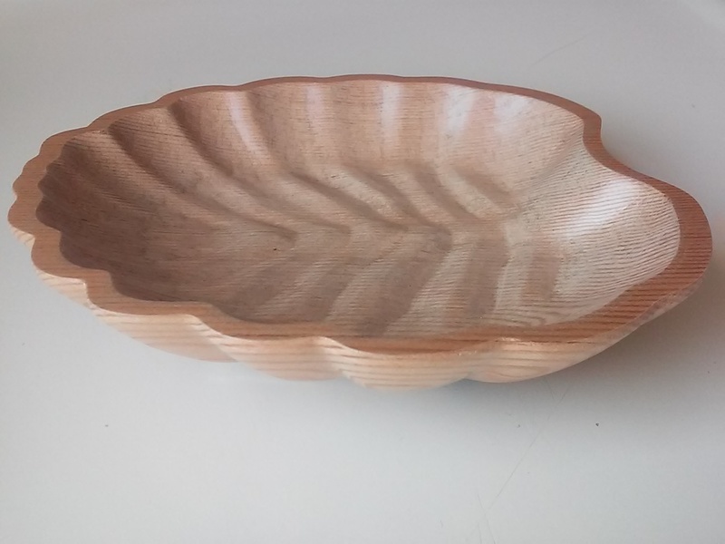 Beech leaf 3D bowl model carved in VG Douglas-fir and finished with WB acrylic. One was customized to accommodate a walnut inlay and feet. Size: ~6 x 5 x 1"