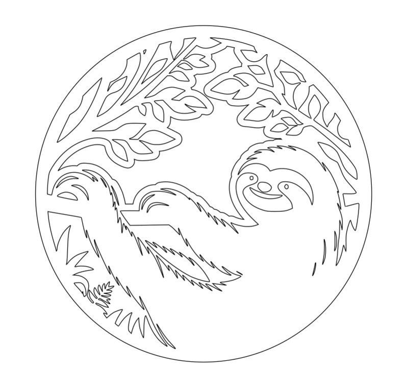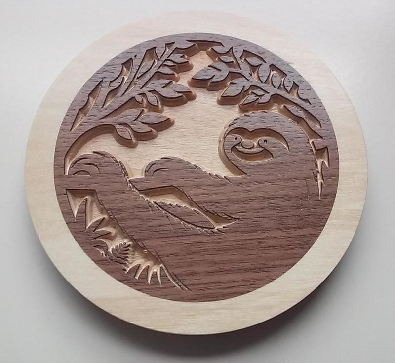Sloth 2.5D carving in Birch and Walnut finished with WB Acrylic. Size: ~5 x 1/2".